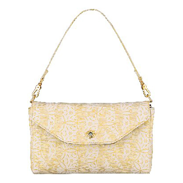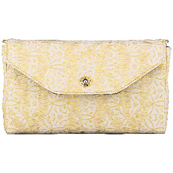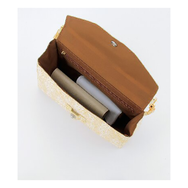 開口部:被せホック式、内部:オープンポケット1・ファスナーポケット1、手提げベルト付(着脱可・長さ調節不可)。柄の出方が一つひとつ異なる場合があります。西陣織とは多品種少量生産が特徴の京都(西陣)で生産される先染の紋織物の総称です。