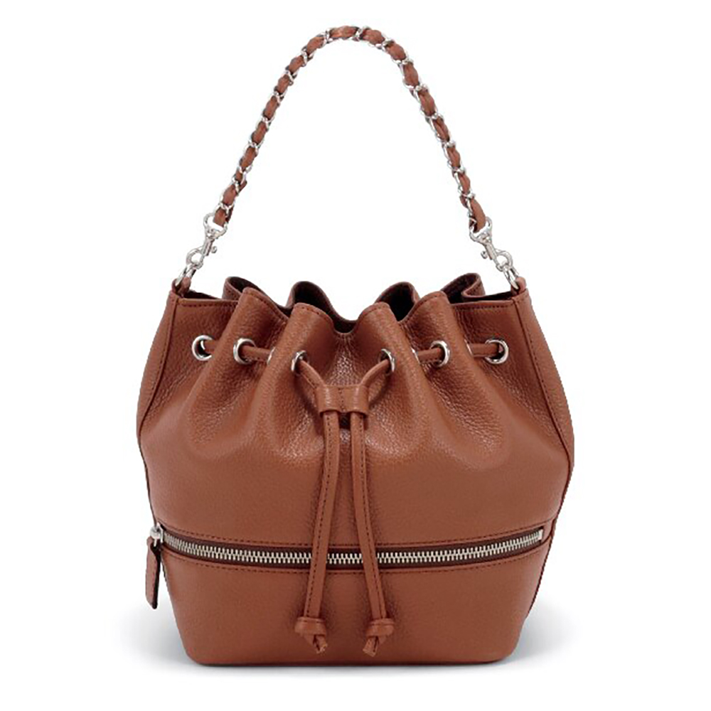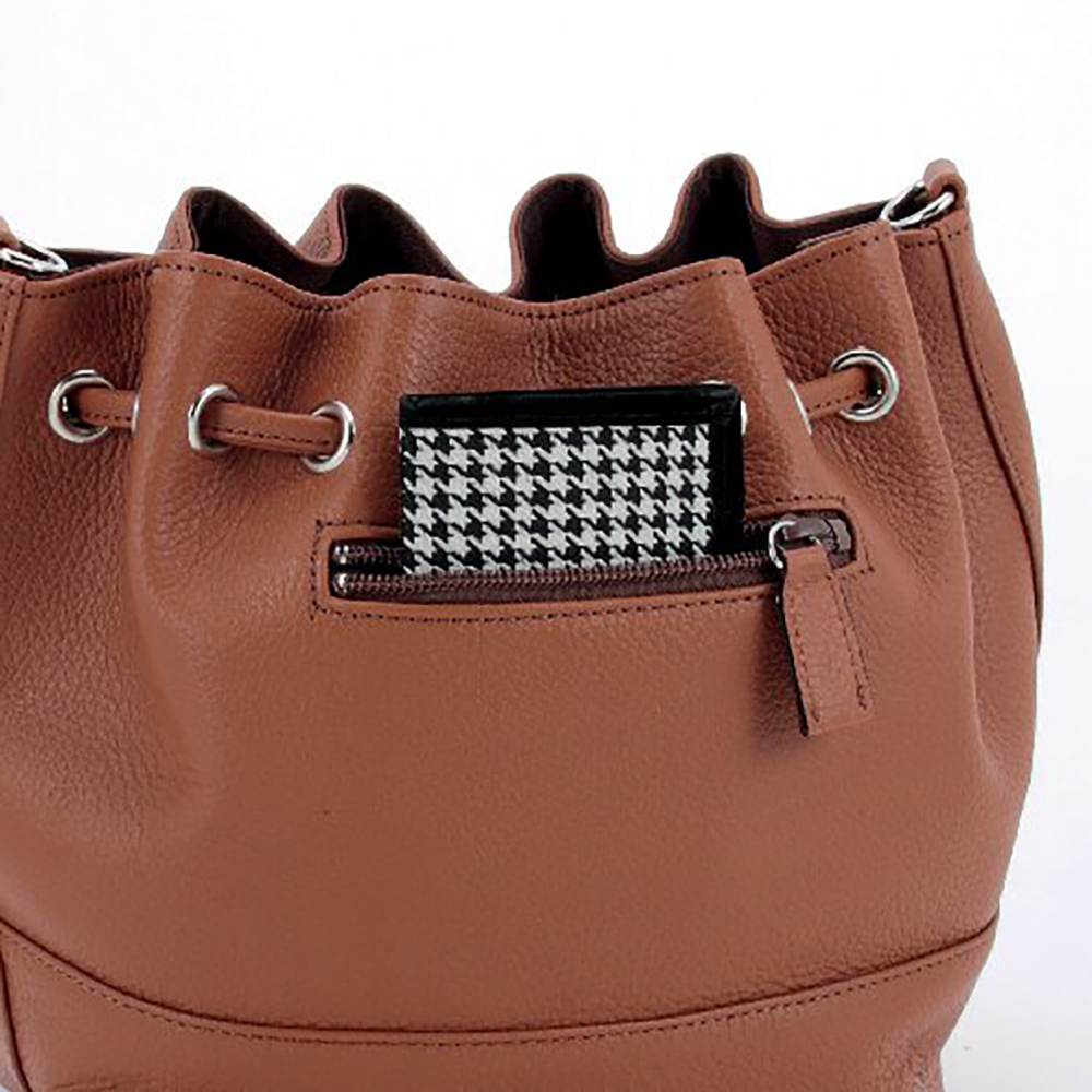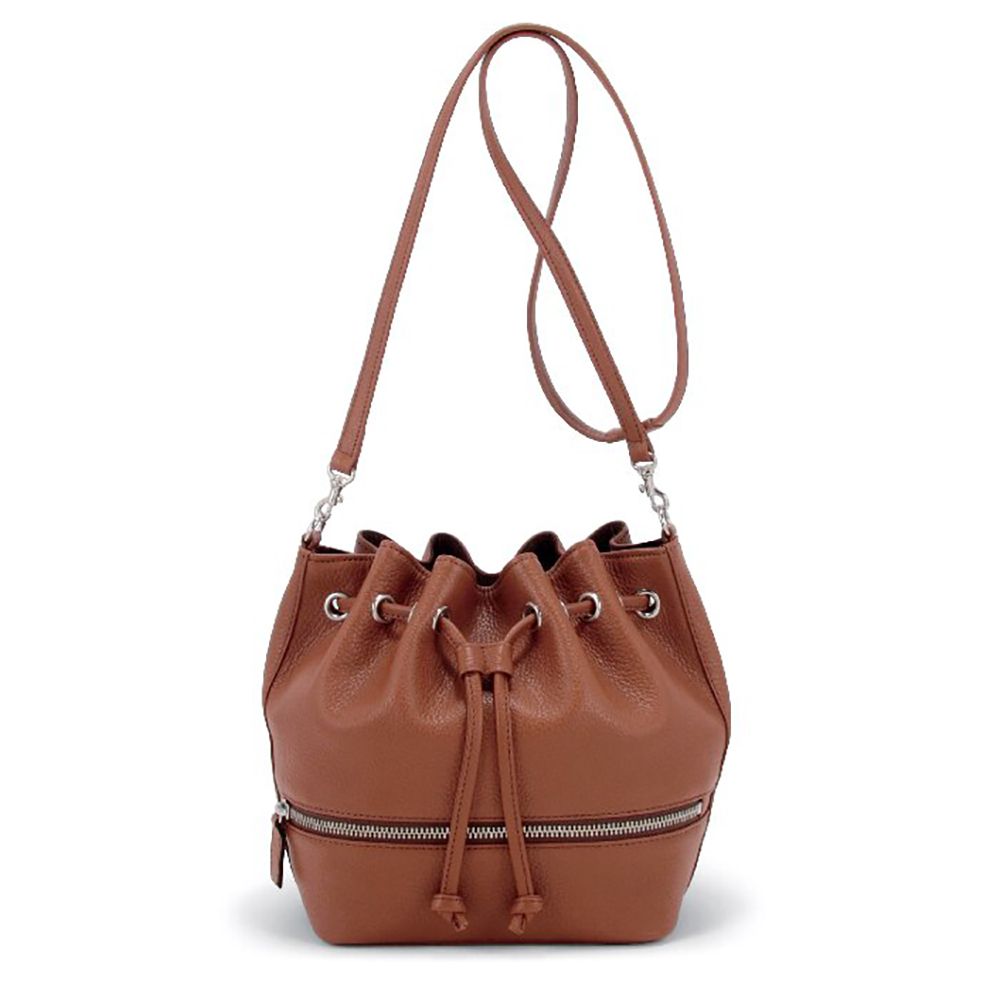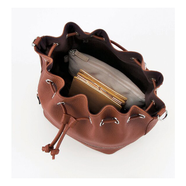 開口部:キンチャク式、外部:ファスナーポケット2、内部:ファスナーポケット1、ショルダーベルト付(着脱可・長さ調節不可)。コロンとしたフォルムがキュートな巾着型バッグ。持手を付け替えて肩掛けやハンドバッグにできます。