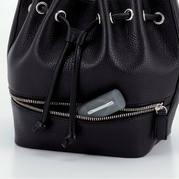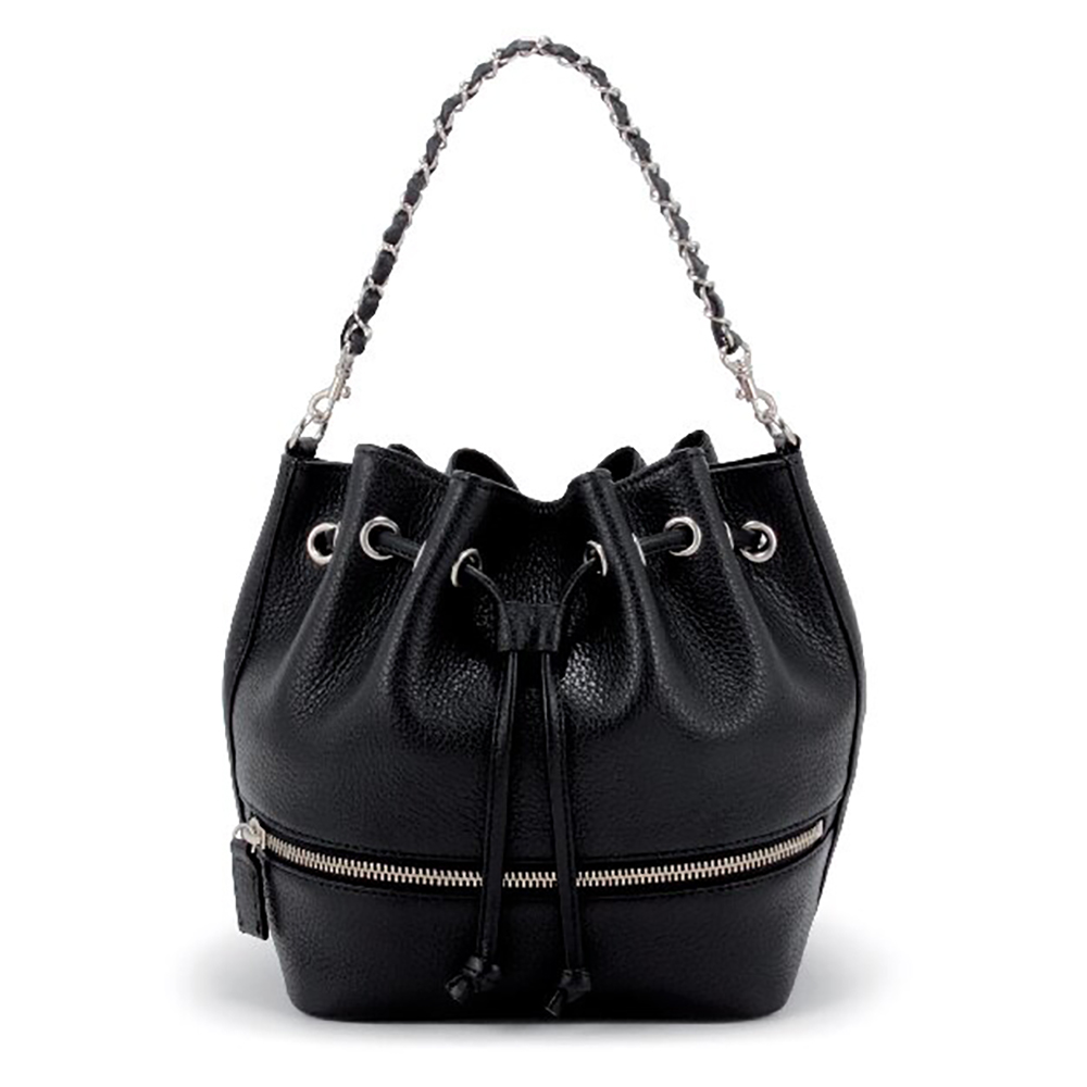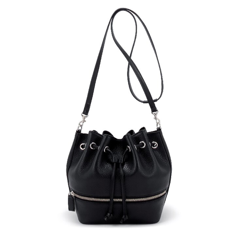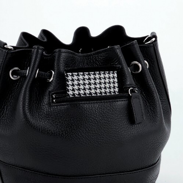 開口部:キンチャク式、外部:ファスナーポケット2、内部:ファスナーポケット1、ショルダーベルト付(着脱可・長さ調節不可)。コロンとしたフォルムがキュートな巾着型バッグ。持手を付け替えて肩掛けやハンドバッグにできます。