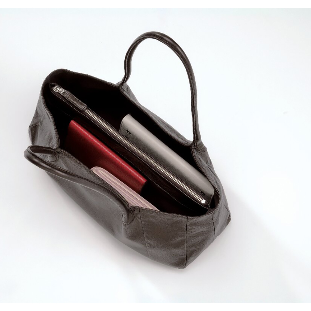 開口部:ファスナー式、内部:仕切りファスナーポケット1(ファスナーポケット内:オープンポケット2)。型抜き、縫製の工程を手を抜くことなく、丁寧なもの作りの姿勢を貫いている石井猛雄氏のセミショルダーバッグです。