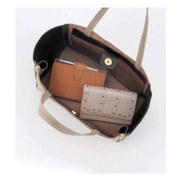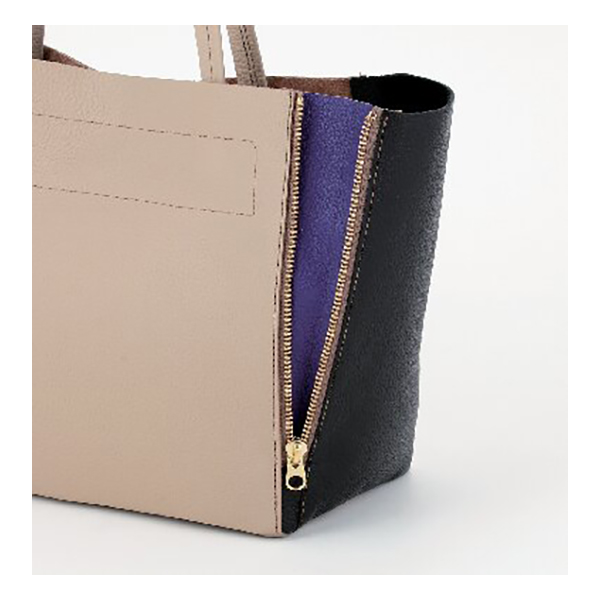 開口部:マグネット式、内部:ファスナーポケット1。サイドのファスナーを広げると、バッグの幅が広がります。サンプル作りから型抜き、縫製、仕上げを手を抜くことなく丁寧な物作りの姿勢を貫いている石井猛雄氏。革職人の誇りとともにある誠実さは彼が生み出す一つひとつに込められています。