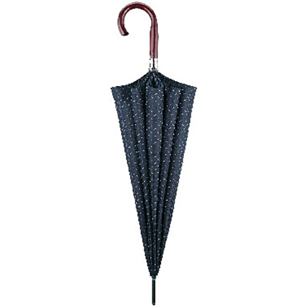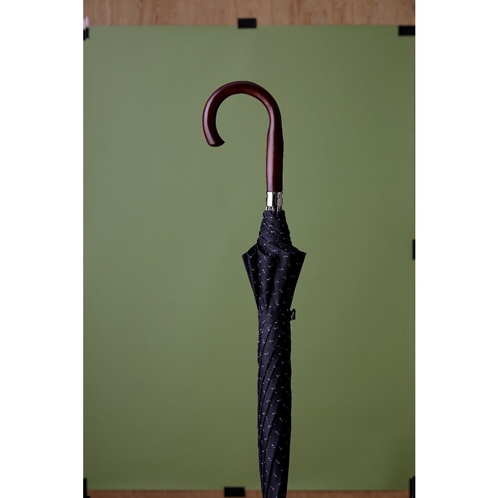 手開き式。傘生地の名産地、山梨県の富士吉田で織られる「甲州織」を使用。細部にまでこだわり、一本一本丁寧に手作りした紳士長傘。特殊な織技術により表裏異なった絵柄を表現しています。木製シャフト(樫の木)・天然木手元仕様です。