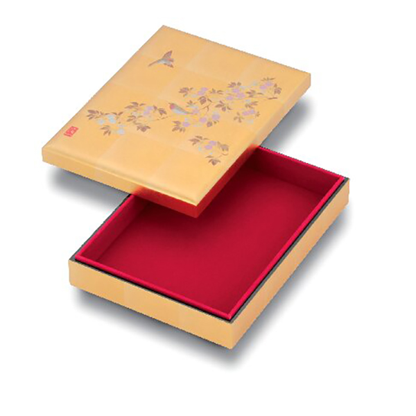 手作り品の為、色・柄・サイズが異なる場合があります。特別な加工で風合いを表現した金沢箔を、一枚一枚手ちぎりで表面の寸法にあわせて貼付けていく伝統技法を用いています。また桜の花と佇む小鳥は「擦り箔盛り上げ技法」という独特の装飾技法を施し、遠近感や立体感で奥行きを演出しています。