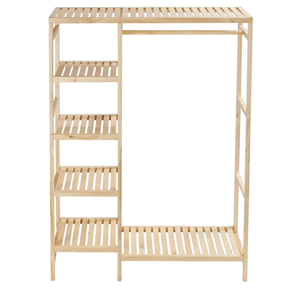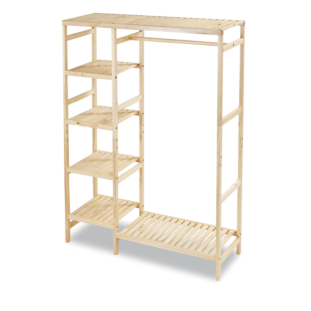 耐荷重:ハンガー部・棚板大・中各約5Kg、棚板小1枚あたり約2Kg。お客様組立品。天然木のパイン材を使用した棚付きハンガーです。衣類を収納し、棚にはハンガー掛けで型崩れしてしまうセーターなども。バッグや小物等が置けるので便利です。