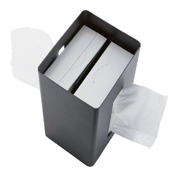 両側に取り出し口がついているので、2種類のペーパーを入れて同時に使うことが可能です。対応サイズ:一般的なサイズのティッシュペーパー・ペーパータオル、高さ約10.5cmまでのティッシュボックス(高さ約5cm以内のティッシュボックス2個)。