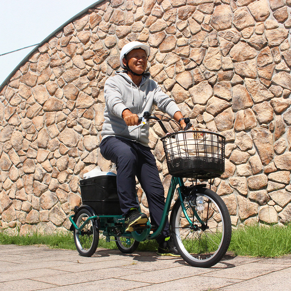 スイング機能付き三輪自転車。小さく曲がれる、スイング機能が三輪自転車。前後には、容量たっぷりの大きなバスケット!お買い物にもお出かけにも便利な1台。