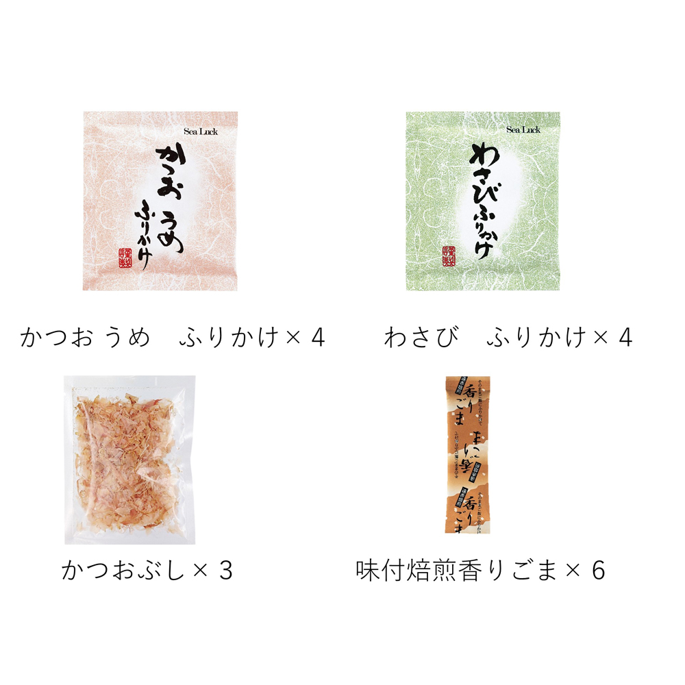 内容:鰹梅ふりかけ2.5g×4、わさびふりかけ2.5g×4、さくら舞削り2g×3、味付焙煎香りごま2.5g×6