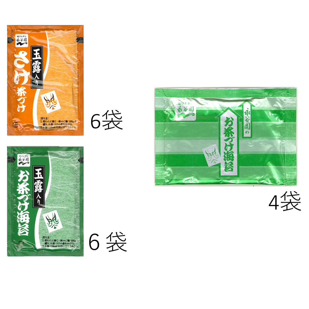内容:海苔茶漬け4袋、鮭茶漬け6袋、海苔茶漬け(玉露)6袋