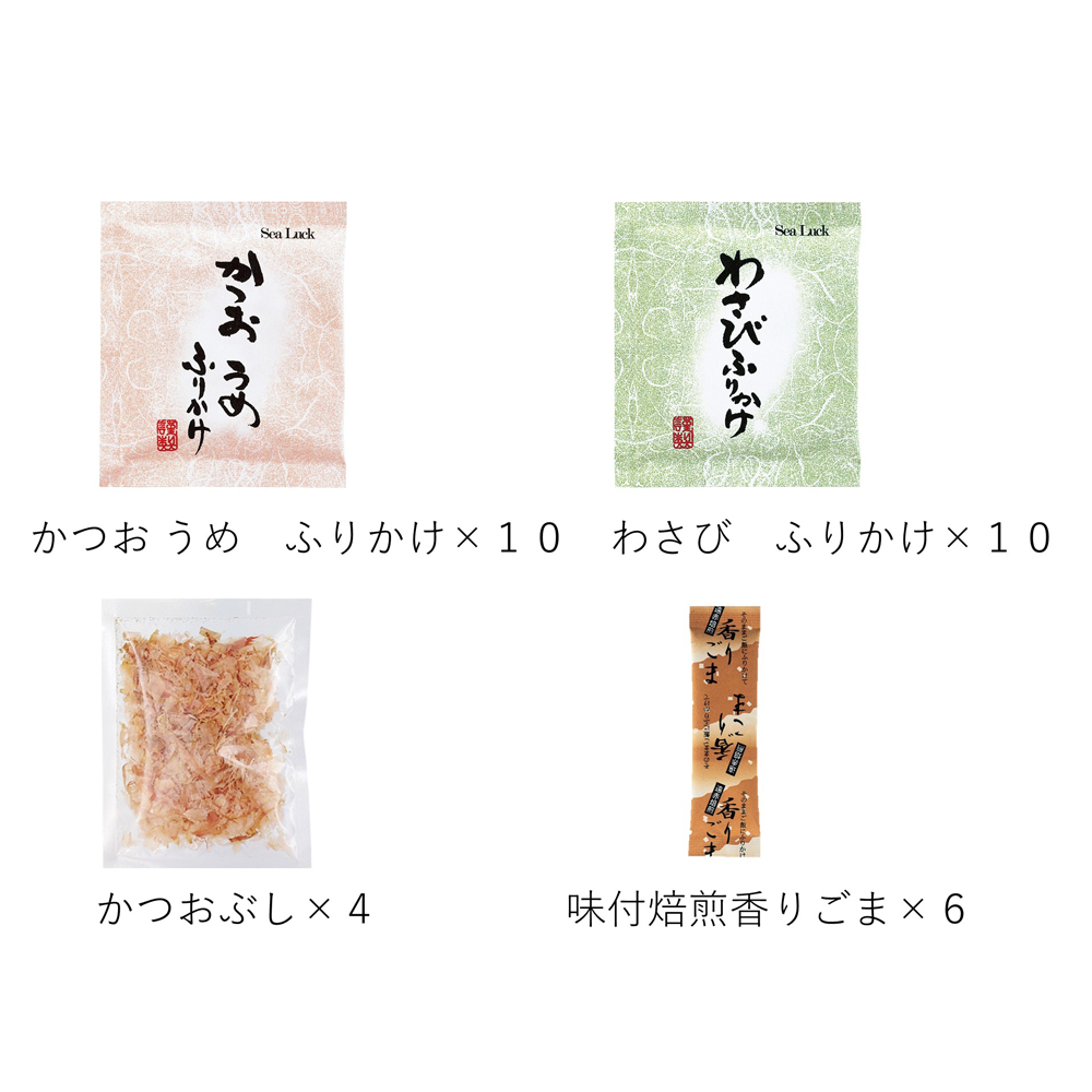 内容:鰹梅ふりかけ2.5g×10、わさびふりかけ2.5g×10、さくら舞削り2g×4、味付焙煎香りごま2.5g×6