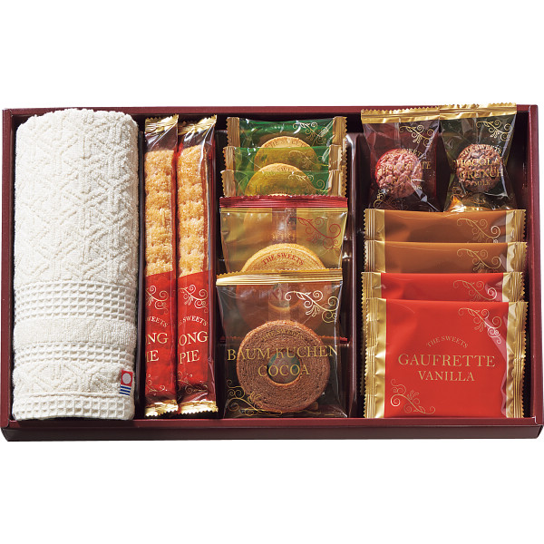 内容:チョコチップクッキー×3・ロングスティックパイ×2・バウムクーヘン(ココア)×1・バウムクーヘン(バニラ)×1・ゴーフレット(チョコ)×2・ゴーフレット(バニラ)×2・チョコレートクランチ(ミルク)×1・チョコレートクランチ(ストロベリー)×1・ウォッシュタオル(約34×35cm・綿100%・日本製)×1
