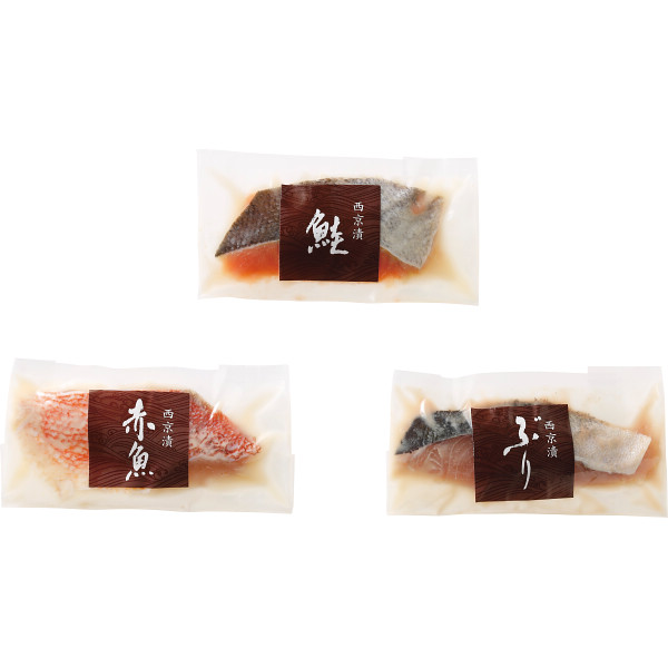 内容:鮭西京漬(骨取り切身使用)60g×4、ぶり西京漬(骨取り切身使用)60g×3、赤魚西京漬(骨取り切身使用)60g×3