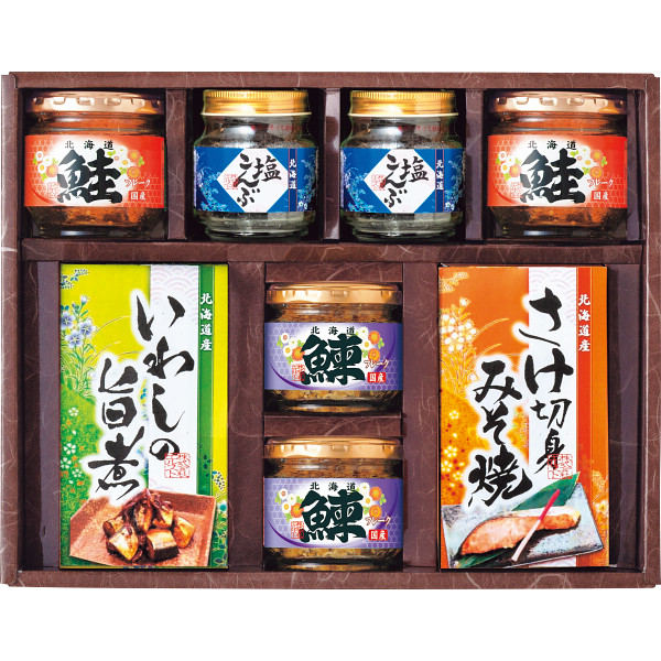 内容:鰊フレーク(北海道産)50g・鮭フレーク(北海道産)40g・塩昆布(昆布:北海道産)18g×各2、さけ切身みそ焼(北海道産)30g・いわしの旨煮(北海道産)95g×各1