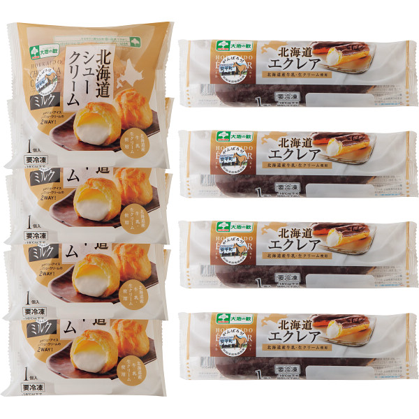内容:ミルクレープ(80g×4)×1、シュークリーム(ミルク)60g×4、エクレア53g×4