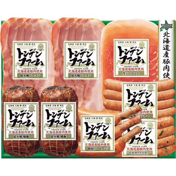 内容:炭火焼ベーコン(スライス)80g・炭火焼焼豚200g×各2、生ハムロース(スライス)40g、荒挽ウインナー120g、ピルカウインナー120g、骨付ソーセージ180g