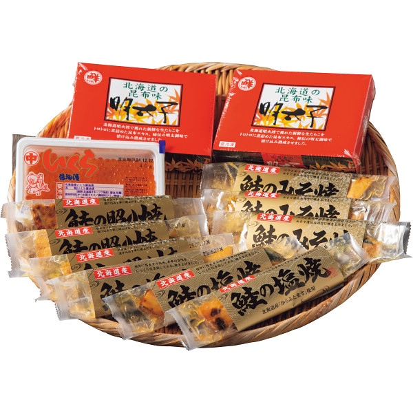 内容:昆布味明太子(すけとうだらの卵巣使用)120g×2、いくら醤油漬け(鮭卵)40g×1、鮭の塩焼き30g・鮭のみそ焼30g・鮭の照り焼30g×各3
