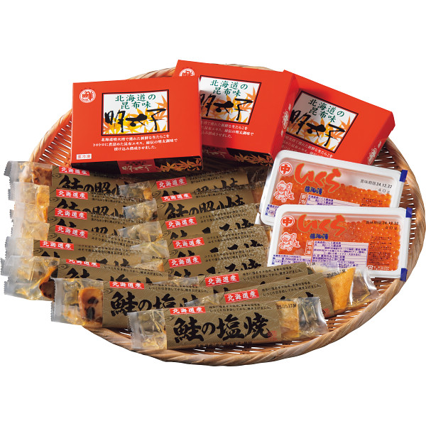 内容:昆布味明太子(すけとうだらの卵巣使用)120g×3、いくら醤油漬け(鮭卵)40g×2、鮭の塩焼き・鮭のみそ焼・鮭の照り焼×各30g×各5
