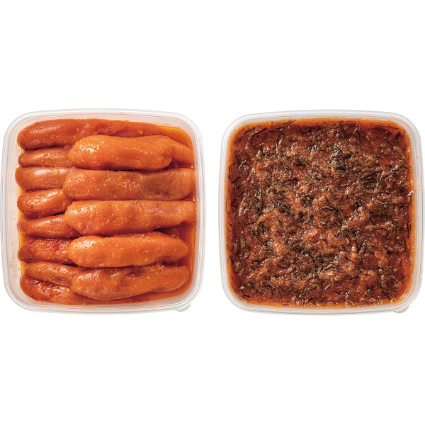 北海道近海で獲れるスケトウダラの卵にこだわり、柚子風味のたれで熟成させた博多辛子明太子と柔らくて美味しい昆布を国産の助惣鱈の卵で和えた昆布明太のセットです。