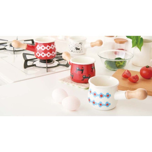それぞれ表情の違った猫達がキュートなプチミルクパン!ミミ・ココ・モモ3匹の実在した猫がモチーフになっています!1~2人分サイズ。ころんと丸いフォルムの本体は両側注ぎ口付!温めたミルクをコップに注ぐのに適します。また、少量のスープをコトコト煮込むのにもよいでしょう。小さくて丸い木の取っ手もチャーミングです。新潟県燕市でひとつひとつ絵柄を丁寧に手で貼り、仕上げているホーローです。ホーローは耐酸性に優れており、酸・塩分に強く、においや汚れもつきにくい性質があります。また色が移らず、雑菌が繁殖しにくいので衛生的です。かわいらしいデザインで、贈り物にも喜ばれます。
