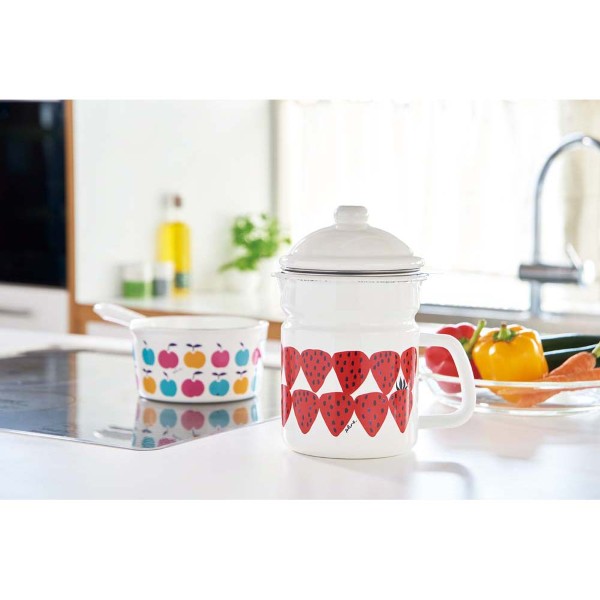 鮮やかで大きなイチゴがおいしそう。みずみずしい色彩で描かれた真っ赤なイチゴたち。白いホーローの地に映えて、まるでクリームで挟んだショートケーキみたい!使用済みの油を、漉しアミで揚げカスを除去して保管ができます。揚げカスを取り除き酸化を防ぐことで油の鮮度を保ちます。ホーローの表面はガラス質でツルツルしているため、汚れを落としやすくお手入れが簡単に行えます。ポットに入れておくことにより、フライパンやホットプレートなどへの油引きがスムーズになります。ホーローは耐酸性に優れており、酸・塩分に強く、においや汚れもつきにくい性質があります。また色が移らず、雑菌が繁殖しにくいので衛生的です。