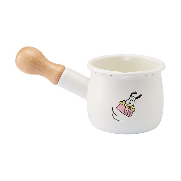 淡いリネンを想わせるような色合いで生活に寄り添う「ブレイクタイムシリーズ」。ゆったりとくつろぎムードで和やかな表情をしたスヌーピー&ピーナッツの仲間たち。穏やかな色調で統一されています。ころんと丸いフォルムの本体は両側に注ぎ口がついています。温めたミルクをコップに注ぐのに適します。また、少量のスープをコトコト煮込むのにもよいでしょう。小さくて丸い木の取っ手もチャーミングです。新潟県燕市でホーローの美しい表面にひとつひとつ絵柄を丁寧に手で貼り、仕上げているホーローです。ホーロー(琺瑯)は鉄などの金属の表面にガラス質の釉薬を高温で焼きつけたものです。ホーローは耐酸性に優れており、酸・塩分に強く、においや汚れもつきにくい性質があります。また色が移らず、雑菌が繁殖しにくいので衛生的にお使いいただけます。