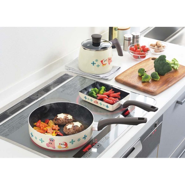 毎日の料理がもっと楽しくなる、星のカービィのキッチンウェアシリーズ。優しい色合いの本体に、カービィやワドルディ、お花のモチーフがあしらわれています。穏やかな色調で統一され、温かみを感じさせるデザインのお鍋です。シンプルでキュートなデザインは、生活に溶け込みやすく日常づかいにピッタリ。少し深めのストレートタイプのフライパン。小回りのきくサイズです。程よい深さと焼き面の広さで炒め物がしやすい。本体内面はふっ素樹脂加工で焦げ付きにくく、お手入れもラクラク。ハンドルはシリコン樹脂塗装で持ちやすく、手に馴染みます。