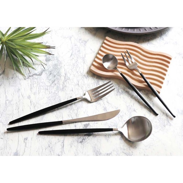 スラリと長い柄が持った時に美しい洋食器です。本体は艶消しで、金属光沢は抑えめ。柄の部分はマット調のブラックなので主張が強すぎず、食卓を自然に引き締めてくれるようなシックな印象です。パキッとした彩度の高いデザインとの相性も良いです。