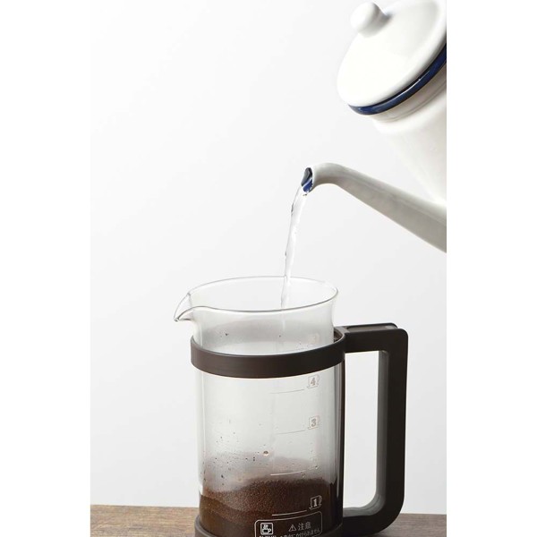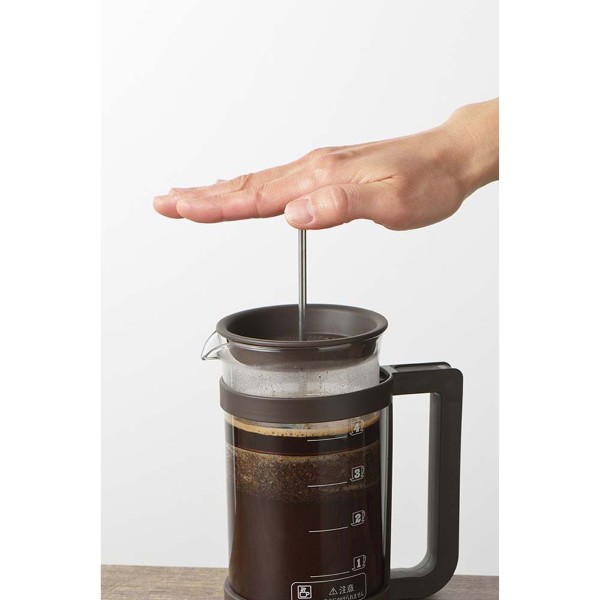 コーヒーや紅茶、緑茶などが楽しめるプレスメーカー。フレンチプレス式のコーヒーの抽出は、容器に入れたコーヒー粉とお湯を金属フィルターで押し込めて抽出します。豆の苦みや香りが多く含まれるコーヒーオイルも抽出するため、ダイレクトな味を楽しみたい方にお勧めです。紙フィルターや布フィルターを使わないことで得られる一味違った本格的な味わいがプレス式の特徴です。お茶の抽出ではティーリーフ(茶葉)がガラス容器内で動いて抽出されるため新鮮な茶葉であればジャンピングが起こしやすくなります。ガラス容器には容量500mlの目盛付。(100ml刻みの目盛です。)ホルダーからガラスポットの取り外しができるため洗浄がしやすい!フィルターは分解して洗うことができます。