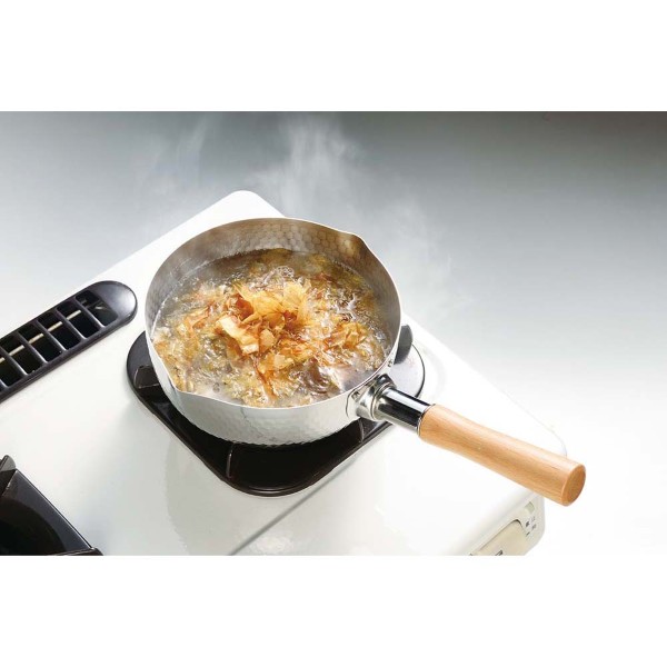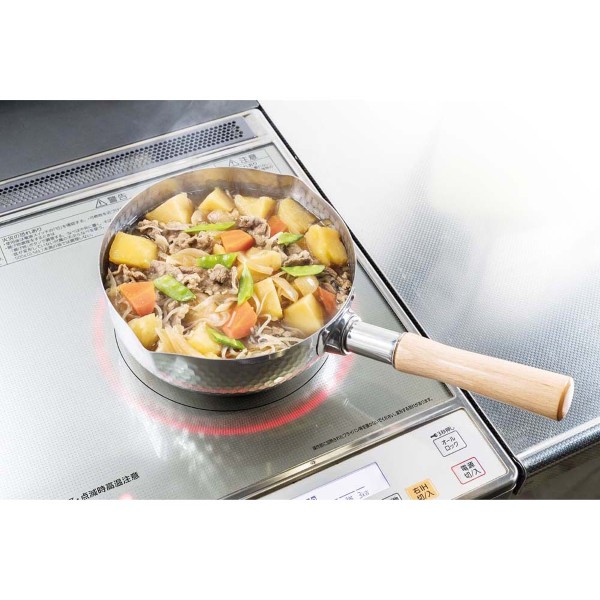 雪深い越後人が生み出した技で作り上げた鍋、天然木で安定感あるハンドル持ち手、直火からIH調理器にもOK。外観には、手作りあふれるような鎚目仕上げ。天然木で使い込むほど手になじむハイグリップ感覚。木柄カツラ部分も熱源に考慮し長く、木柄止めネジも長く2本止め。