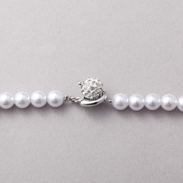 内容:●プラスチックパール(人工真珠)・真鍮(ロジウムメッキ)・樹脂・ラインストーン●現品(全長)約120cm・約6.5mm珠・クリップ式留め具