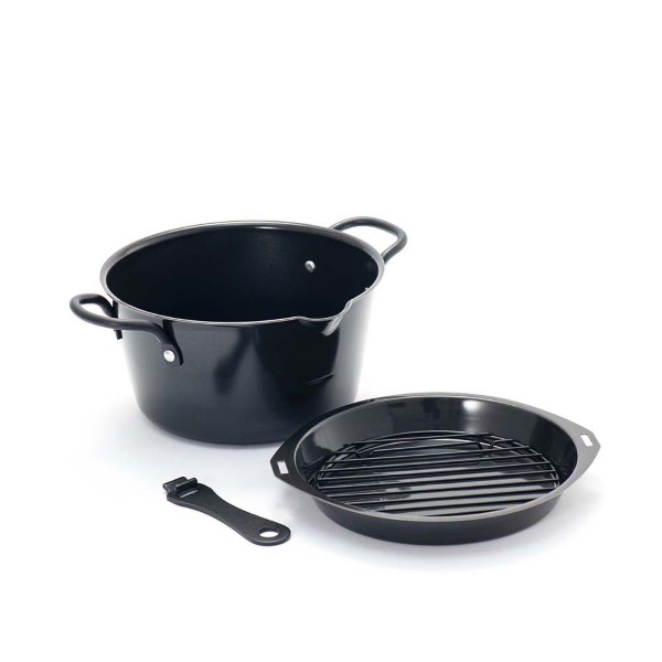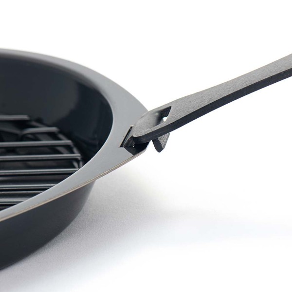 5つの機能がこなせる機能的な揚げ鍋。揚げ鍋・バット・バットアミ・ハンドルのセットで、それぞれ機能的に使用できます。お弁当作りや少量の揚物などに、手軽に揚げ物ができます。ハンドルは着脱できるため、場所をとりません。バットは油切りだけでなく、グリルプレートやフライパンとしても活躍します。オーブンや焼く調理後は、ワンプレート料理としてそのまま食卓に出すことができます。