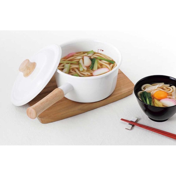 シンプルなフォルムとニュアンスカラーは飽きがこず、どんなシーンにも合います。内面には目安目盛り入りで使いやすい機能をプラス。取っ手とツマミは熱くなりにくく優しく手に馴染む天然木を採用。表面がガラス質のホーローはニオイ・汚れが付きにくくついても洗えばスッキリ落とせ、酸・塩分にも強く食品に影響がなく色も末永く保ちます