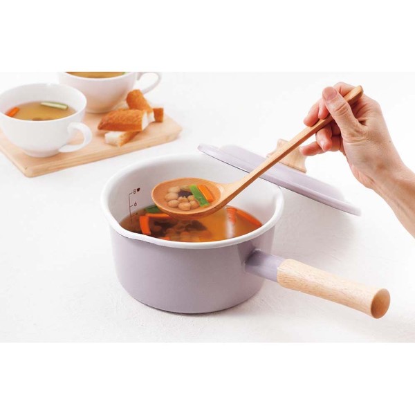 シンプルなフォルムとニュアンスカラーは飽きがこず、どんなシーンにも合います。内面には目安目盛り入りで使いやすい機能をプラス。取っ手とツマミは熱くなりにくく優しく手に馴染む天然木を採用。表面がガラス質のホーローはニオイ・汚れが付きにくくついても洗えばスッキリ落とせ、酸・塩分にも強く食品に影響がなく色も末永く保ちます