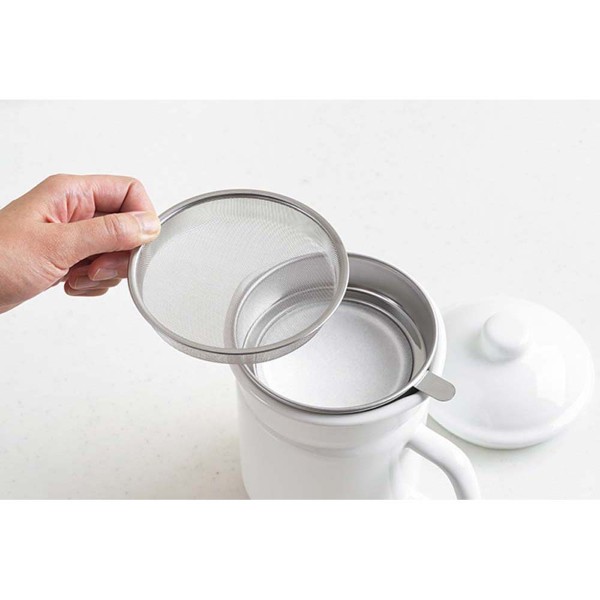 活性炭フィルター付の琺瑯製オイルポット。こしアミ&活性炭フィルターでダブルでこせます。揚げカスを除去し、油のニオイも軽減するため、より油をきれいに保管することができます。琺瑯の表面はガラス質でツルツルしているため、汚れを落としやすくお手入れが簡単に行えます。天ぷらや揚げ物に使用した油を濾して再利用することができます。ポットに入れておくことにより、フライパンやホットプレートなどへの油引きがスムーズになります。