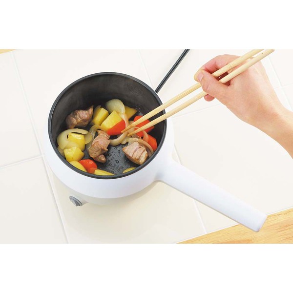 電気で加熱できる片手鍋。コンロやIHがなくても、ダイニングで、オフィスで煮る・茹でるの調理ができます。即席麺やちょっとした調理にオススメ!電気を使用して加熱するので、コンセントがあれば手軽に使えます。「加熱」と「保温」の2段切り替えスイッチで、簡単モード切替え!調理時は「加熱」、作ったあとは「保温」と、用途に合わせて使い分けることが出来ます。一定の温度を保ってくれるので鍋物やしゃぶしゃぶにもピッタリ。チーズやチョコのフォンデュ鍋としても楽しめます。非着脱式の内鍋には、汚れや焦げがつきにくいフッ素樹脂加工を施しています。使用後は濡れた布巾などで拭くだけの簡単なお手入れでOK。ゆでたまごを作るのに便利な専用のラック付き。ラックにセットした卵と水を入れて加熱するだけで、簡単にゆでたまごが作れます。