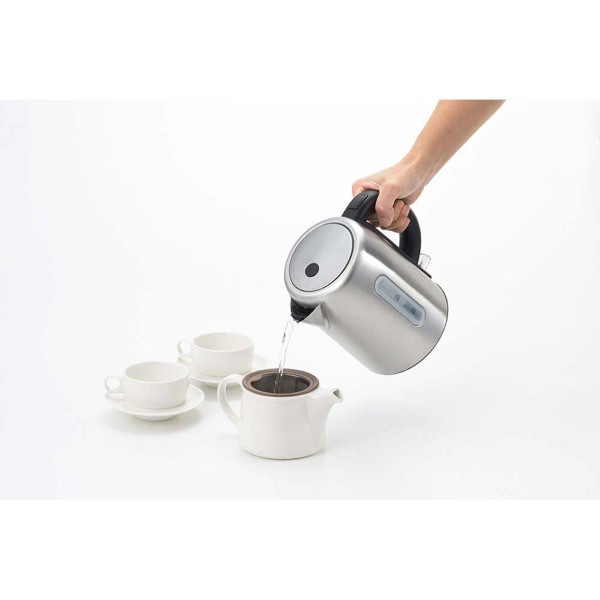 ステンレスカラーの飽きの来ないシンプルなデザイン。内側もステンレス製で衛生的。フォーマルからカジュアルまで、シーンを問わず長くお使いいただけます。キッチンではもちろん、リビングやオフィスでも欲しい分だけ手早く沸かせます。沸騰すると自動的に電源が切れるので、無駄な電気を使いません。蓋はワンタッチ式でラクラクオープン。お湯の残量が分かる目盛付き。スイッチひとつでお湯が沸きます。本体はコードレスタイプなのでお湯を注ぐ際にコードが絡みません。