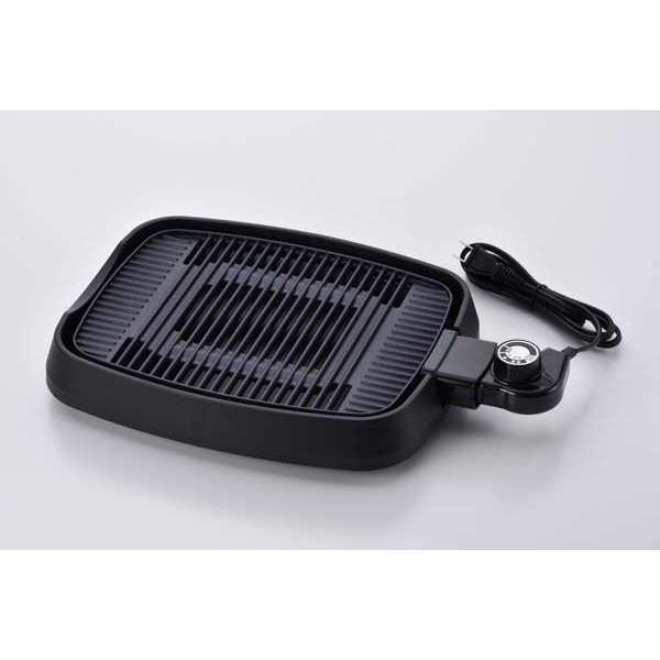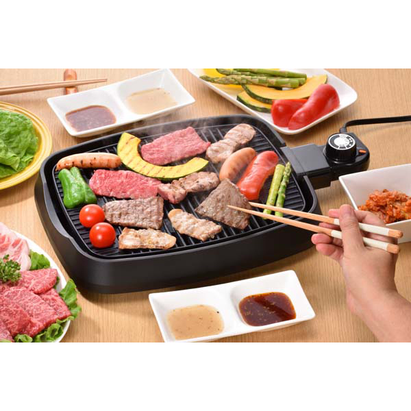 卓上でお肉が簡単に焼けるグリルプレート。余分な油が落ちてヘルシー調理。温度調節付きで調理から保温まで対応。場所を取らないA4サイズのコンパクト設計。プレートは差込口以外は水洗い可能。