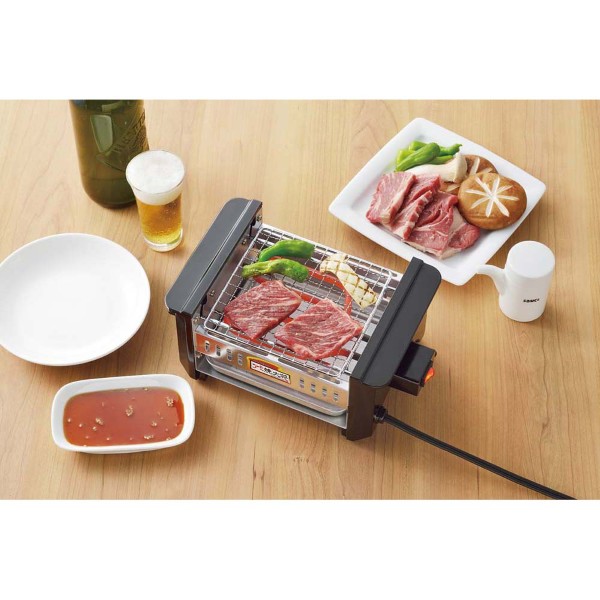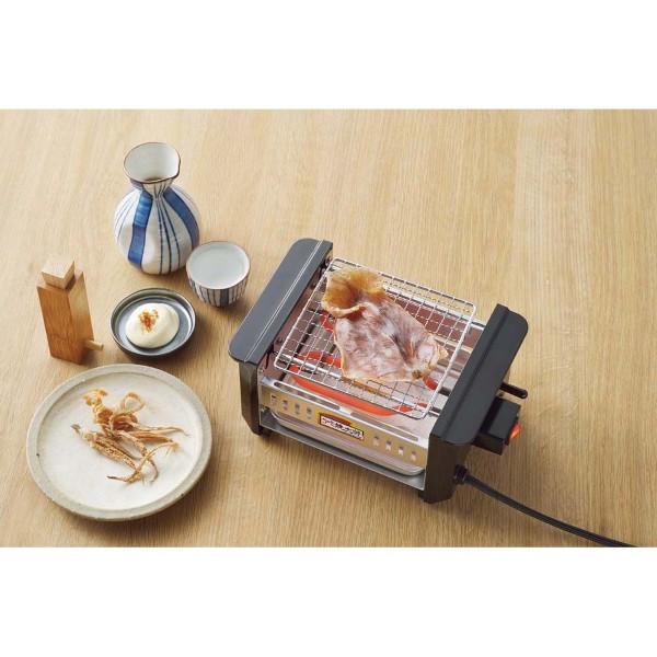 内容:本体:フェノール樹脂・鉄、網:鉄(クロムメッキ)、油受けトレイ:鉄、コードの長さ:約1.5m、AC100V/650W、50/60Hz、付属品:油受けトレイ・焼き網