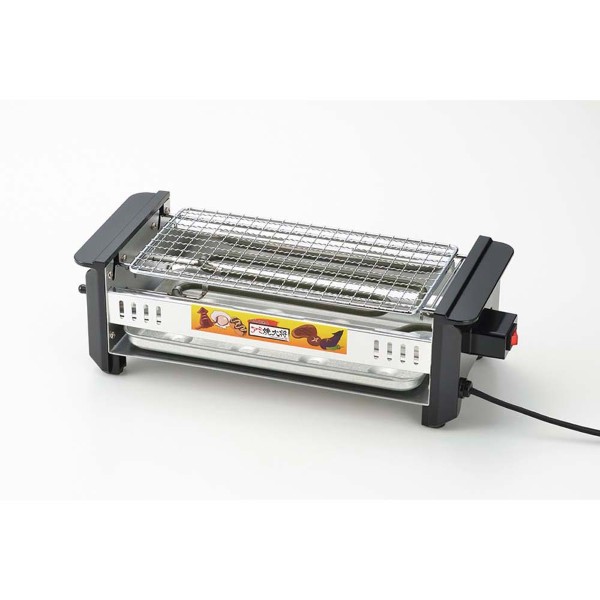 内容:本体:フェノール樹脂・鉄、網:鉄(クロムメッキ)、油受けトレイ:鉄、たこ焼きプレート:アルミニウム合金(フッ素樹脂塗膜加工)、コードの長さ:約1.5m、AC100V/1,000W、50/60Hz、付属品:油受けトレイ・焼き網・たこ焼きプレート
