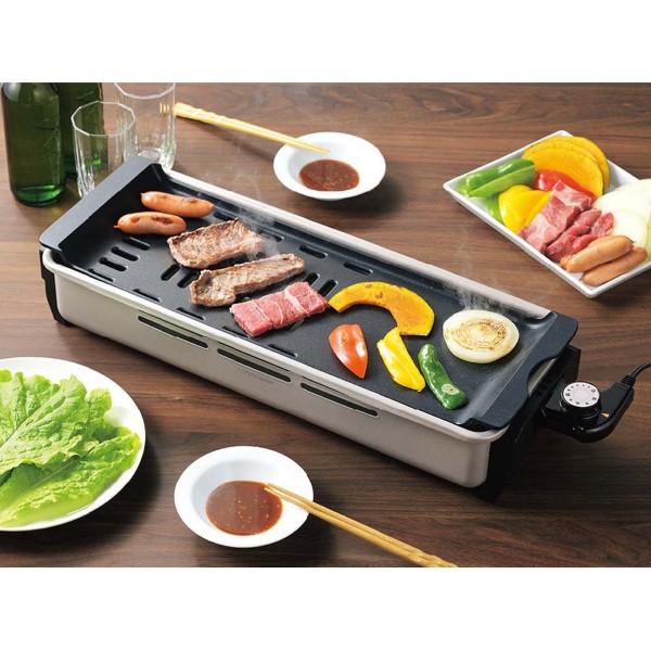 テーブルの上でも場所を取らない長細いスリム形のグリラー。プレートは平面と穴開きに分かれています。プレートの穴開き部で肉を焼くと余分な脂が下に落ちてヘルシー。脂が水に落ちるので煙も出にくい消煙タイプ。