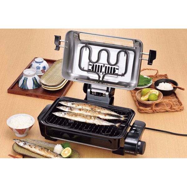 サンマ4匹が焼けるフィッシュロースター。裏返し不要の上下ヒーター。焼き網の裏表で高さを変えられる。ニオイを軽減、消臭フィルター付き。30分まで対応、タイマー付き。分解出来て水洗いOK。