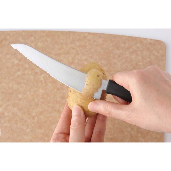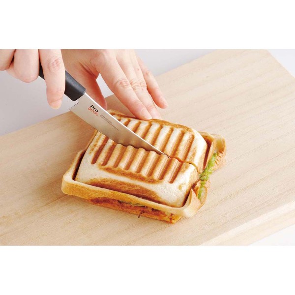波刃とストレート刃で多用途に使える。ストレート刃で食材の皮むきに。波刃で、カリカリに焼いたホットサンドに。