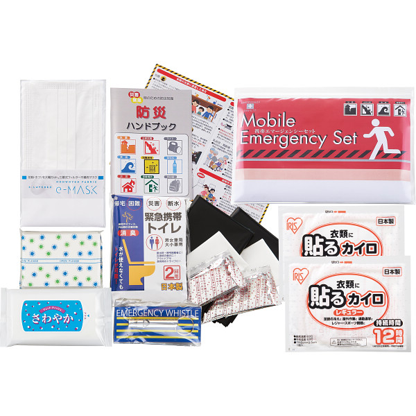 内容:チャック袋・ホイッスル・ウェットティッシュ(10枚)・ポケットティッシュ・マスク・防災ハンドブック・IDカード台紙・緊急携帯トイレ2P×各1、カイロ×2