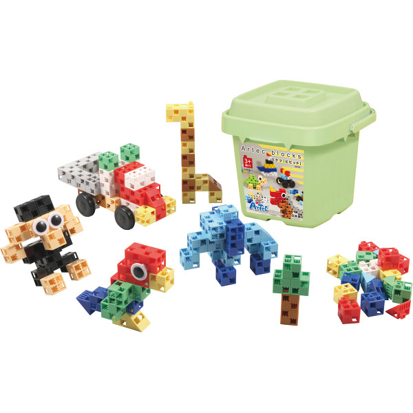 内容:基本四角×110ピース、ハーフ×10ピース、基本三角×10ピース、回転軸×4ピース、タイヤ×4ピース、丸×4ピース対象年齢:3歳~ST合格品