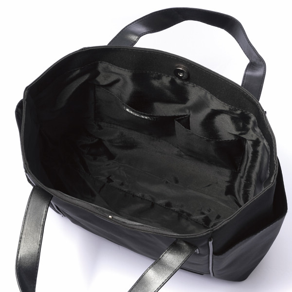 シンプルなトートバッグはシーンを選ばず使用できます。サイドのポケットが便利です。