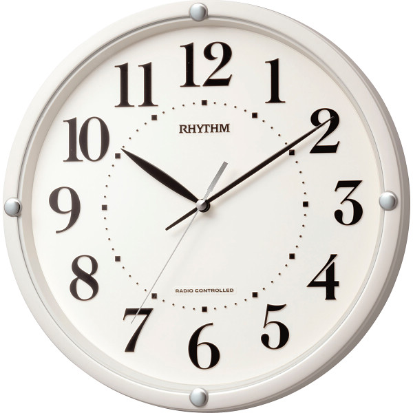 立体文字で遠くからでも見やすいスタンダードな電波掛時計です。輝くガラス留め飾り付の白基調としたデザインで、コチコチ音がしない連続秒針なので置く場所を選ばず使用できます。