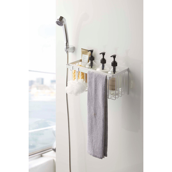 浴室の壁面に強力マグネットで取り付けることができる便利なマルチバスケット。ディスペンサーボトル・チューブをまとめて収納。手前のバーにはタオルなどを横から掛けられます。バス用品、お掃除用品、水切りワイパー・ブラシ・スプレー・バズブーツなどの収納にも。水切れがいいから乾きやすく、おもちゃ収納にも便利。接着面が少ないからぬめりにくくお手入れ簡単。小物をかけられる便利なフック付き