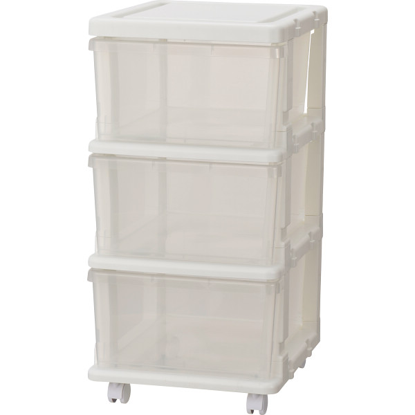 3段引出し収納。中身が見えないホワイトタイプと中身が見えるクリアタイプの2種類。キャスター付きで移動もラクラク。引出しはストッパー付きで抜け落ちを防ぎます。組立間違えが少ない親切設計。