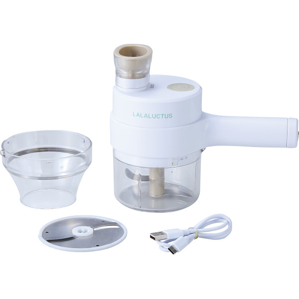 内容:電源=リチウムイオン充電池3.7V/1.5Ah・消費電力=40W充電時間=約4時間付属品=指巻き込み防止パーツ、スライサーカッター、スライサー容器、チョッパーカッター、チョッパー容器、プッシングバー、Type-C充電用ケーブル