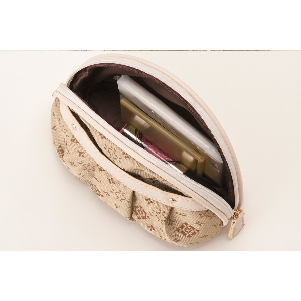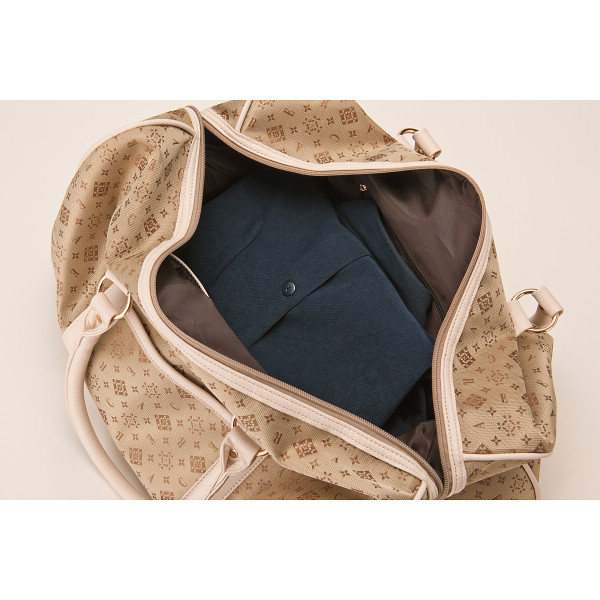 上品なモノグラム生地を使った収納力たっぷりのボストンバッグと、大きく開いて中身が出し入れしやすいポーチのセット。