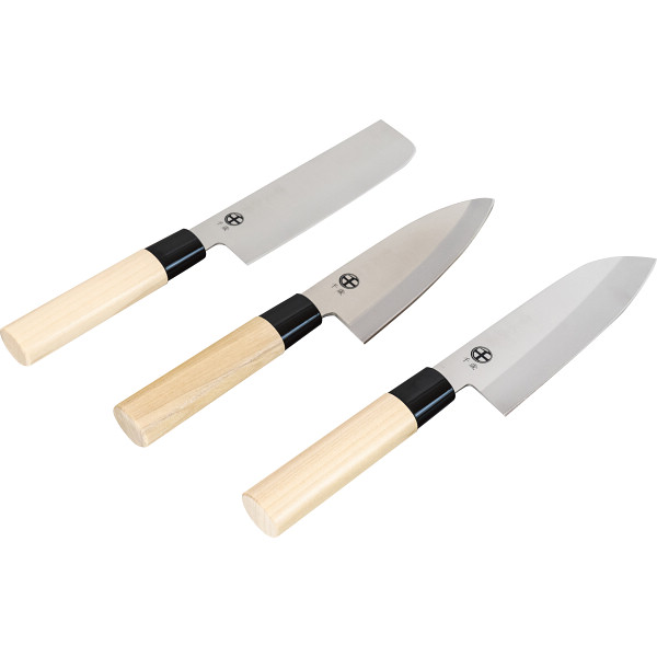 さびにくいモリブデン鋼を使用し、手なじみのいい天然木のハンドルの包丁セット。